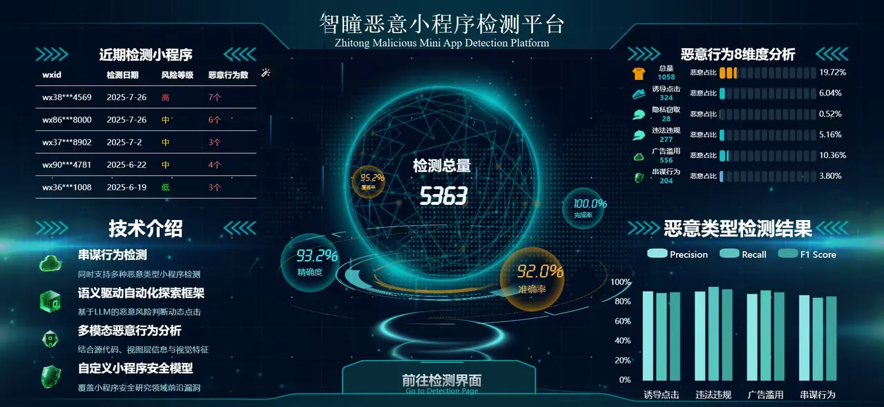 团队聚焦于恶意小程序检测,尤其是新型串谋行为小程序识别问题,设计了“智瞳:面向串谋行为的恶意小程序检测系统”,融合“慧眼识珠”典故,展现出项目的技术与文化双重内涵。智瞳创新性地构建基于感知-理解闭环的语义驱动动态探索框架,提出多模态融合检测方案,通过行为图谱构建和大模型风险感知分析小程序恶意风险,为平台监管提供智能、高效、可扩展的小程序安全检测方案。