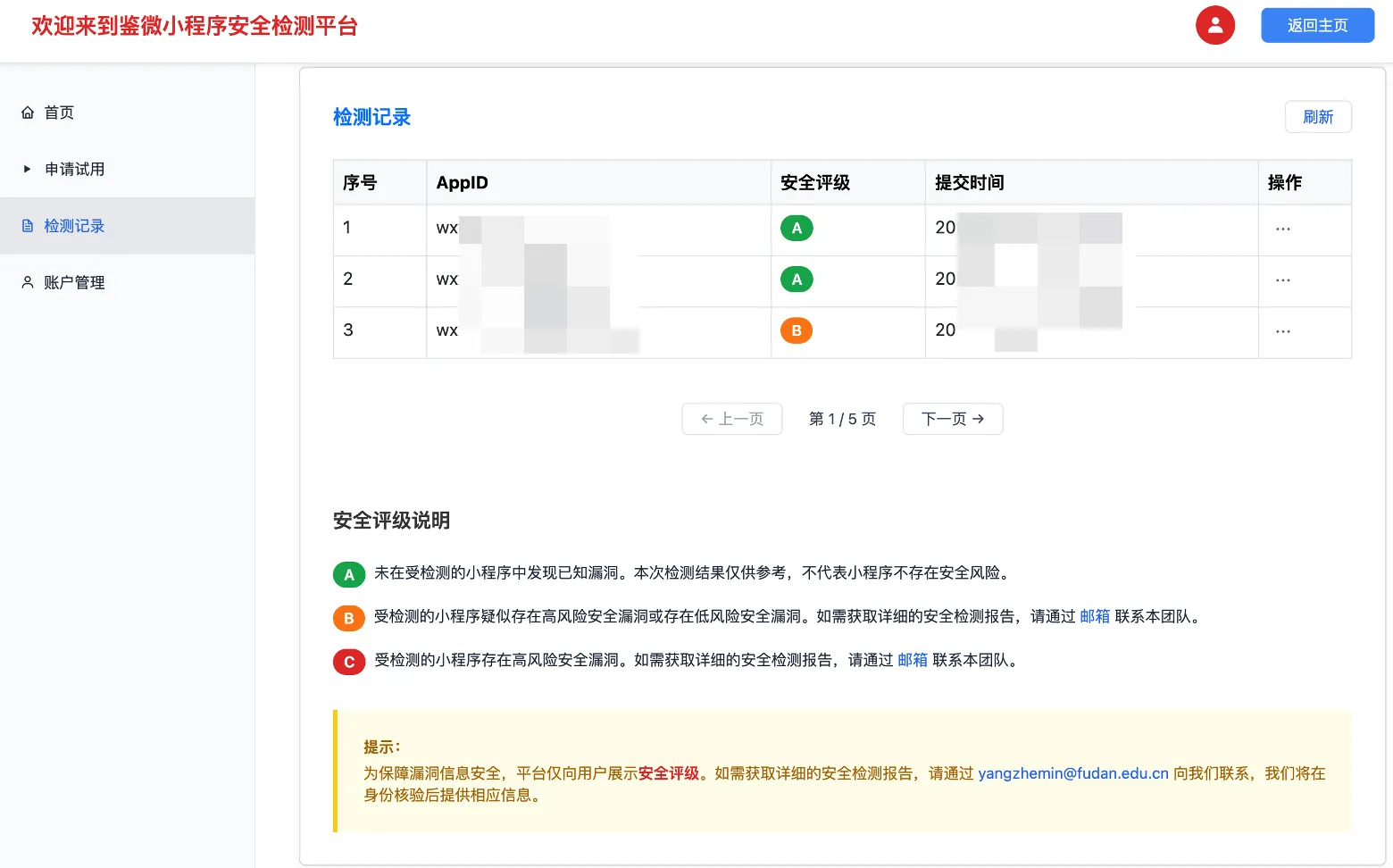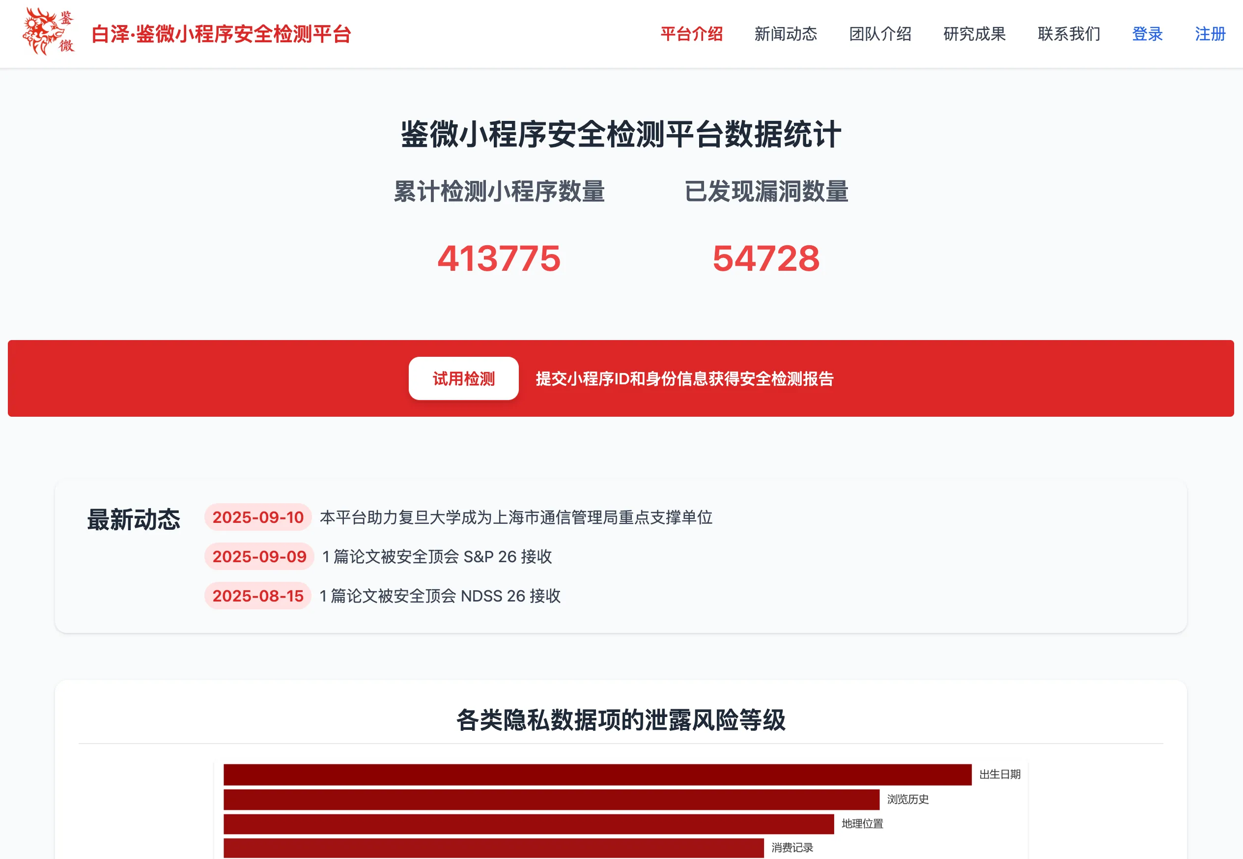 联系方式:yangzhemin@fudan.edu.cn 白泽·鉴微小程序安全检测平台:https://security.fudan.edu.cn/miniappplatform 复旦大学系统软件与安全实验室:https://security.fudan.edu.cn