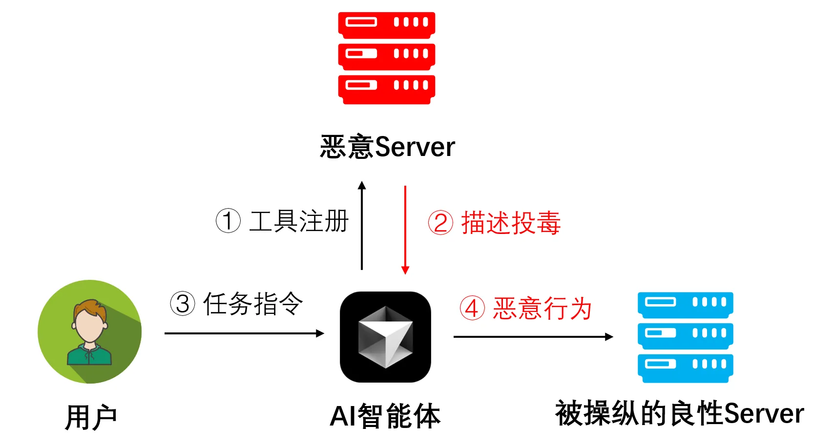 攻击者也能利用此机制创建恶意MCP Server,在向LLM提供工具描述时注入恶意指令,进行基于工具描述的直接投毒攻击。这样一来,被“毒化”的LLM在收到用户的正常请求后,可能会无视用户本意,转而执行攻击者预设的恶意任务,如泄露隐私、生成有害内容或攻击系统。