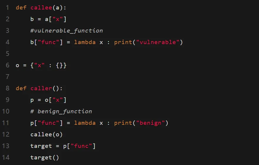 在这段代码中,p和o[“x”]互为对象别名,指向同一片内存。callee()修改了该对象的内部字段,使得原本的安全函数被替换成了“vulnerable”函数。最终调用 target()时,程序行为发生了变化。