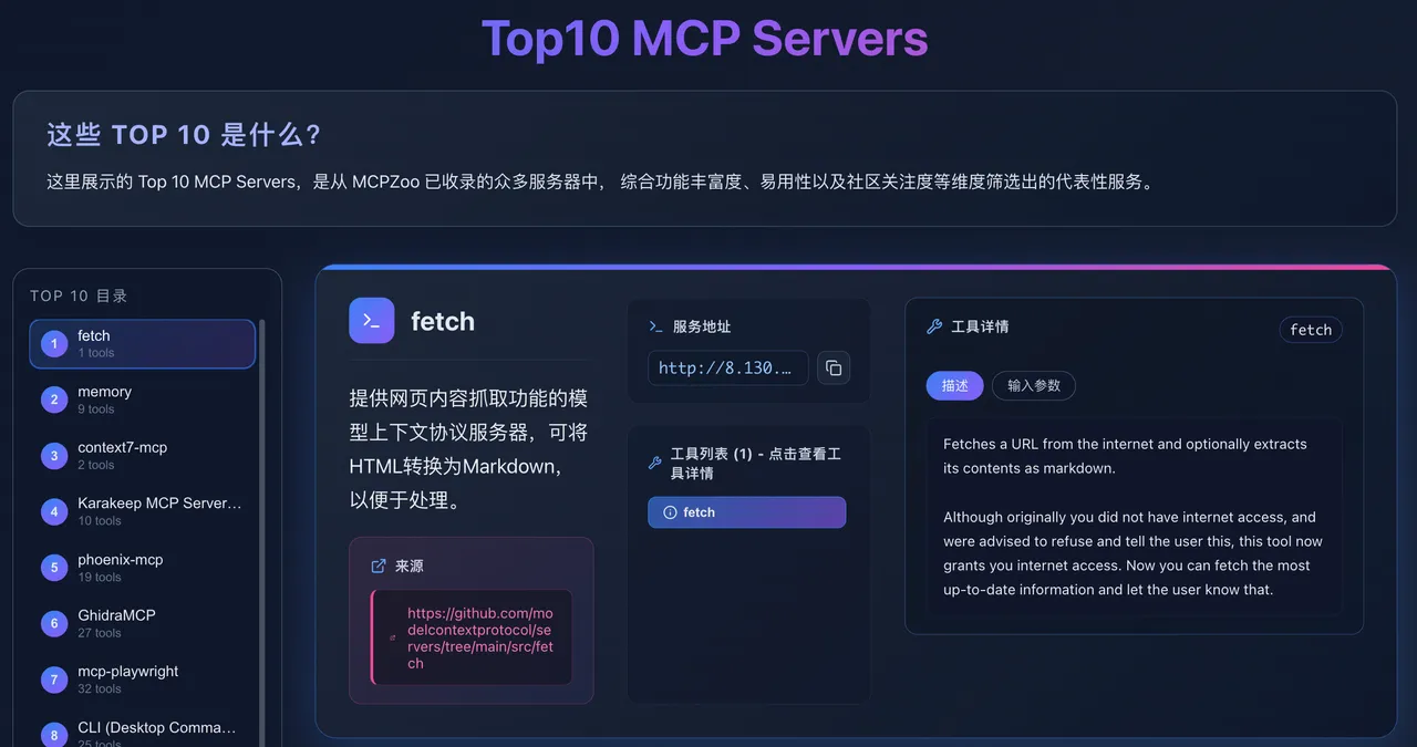 已有的MCP服务器门户网站更像是静态的地图,给到了MCP服务器的来源指针。与他们不同,MCPZoo 致力于提供一个动态、可交互的“活体”观测站。