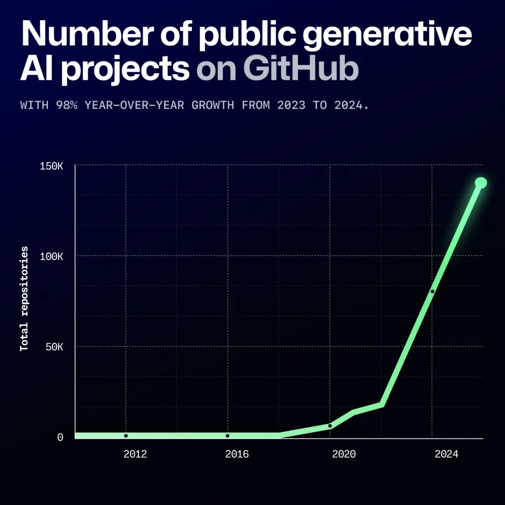 根据 GitHub 2024 开发者报告,全球 76% 的程序员已在日常使用 AI 编程工具。每个月生成的 AI 代码量高达 950 亿行——相当于人类过去十年合计的编码量。