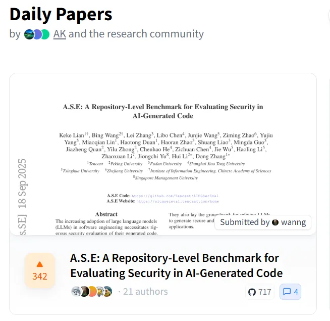 A.S.E 论文发布后,首周即登上 Hugging Face 日榜与周榜热度第一,体现了行业对「AI 生成代码安全」方向的高度关注与认可。